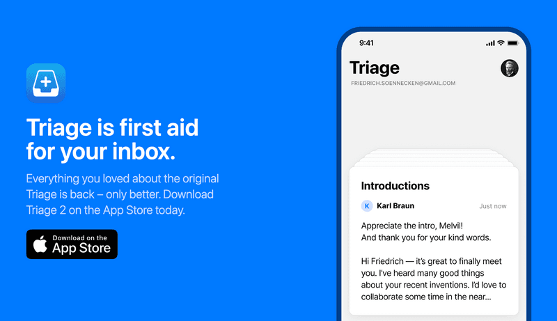 Triage is first aid for your inbox! Quickly swipe left to archive, swipe right to keep, or to create your own custom work flow. Managing your inbox will hopefully not feel as much as a chore.