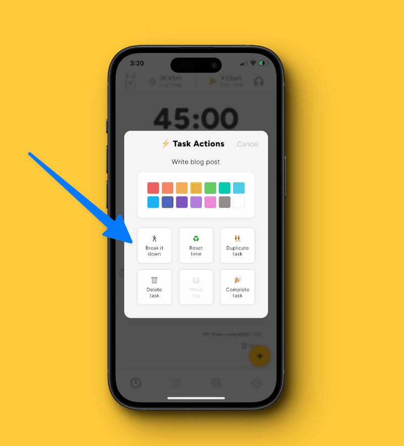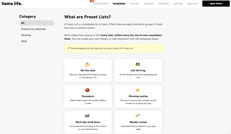 Llama Life also has a feature which uses AI to break down your tasks for you. For example, if you input a larger task like "create influencer marketing strategy", Llama Life can quickly offer a list of smaller relevant sub-tasks. These smaller tasks will then appear in your to-do list where you can modify the description or allocated time. You can also save these tasks as a Preset List, which you can load again in the future.